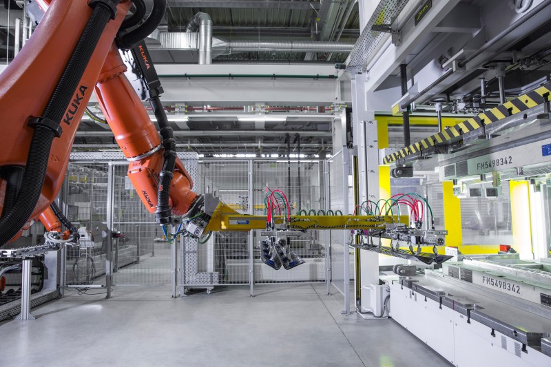 紧接着,工作台移至进料位置,一只机械手将浸渍了树脂的叠层织物放入压机;随后,压机合模并在150℃使树脂固化;开模后,再由机械手将固化部件移入冷却压机进行冷却;移出冷却压机、经由放电转换器进行质量检测后,部件才能进入下一步装配环节。