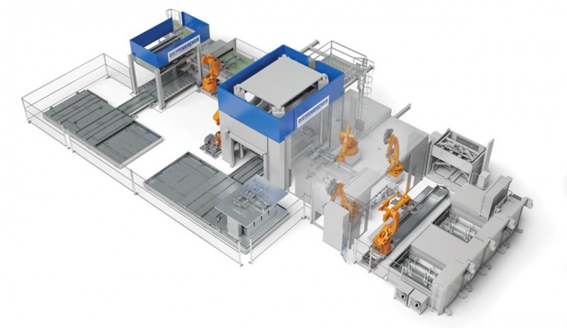 Dieffenbacher报告称,湿法模压工艺自动化程度很高,其中全自动换件系统可以将更换部件的周期控制在约10min。宝马的湿法模压线同时采用了Dieffenbacher的CompressLite压机系统,使操作更适合周围的自动化环境,同时精度更高、更节能。