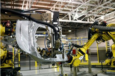 在Wayne的一家福特工厂里,黄色的FANUC机器人旋转着林肯MKC运动型多用途车的后舱盖板,自动涂胶机在其表面喷涂牙膏状的环氧基树脂,四台同步化的机器人将舱口的内部外部夹紧。