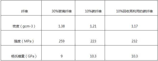 表1,回收再利用的碳纤维增强热塑性复合材料的性能(数据来源:Albis 英国)