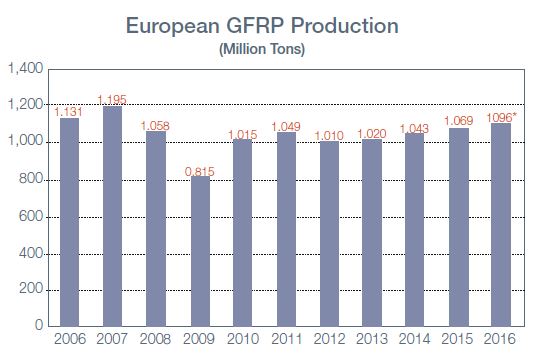 就玻纤复合材料而言,欧洲总产量于2015年达到107万吨,处于八年来的高位,年均增长2.5%,呈平缓上升态势。其增长速度小于复合材料行业的增速,也比欧洲热塑性纤维复合材料的增速有所逊色。