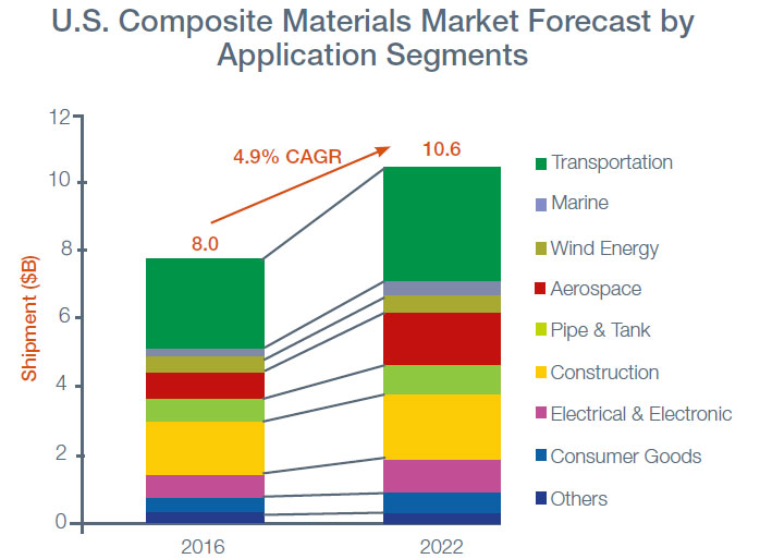 商用航空工业一直是复合材料行业增长的主要驱动因素。到2022年之前,其增长速度将保持在5%左右。考虑到一大批航空OEM企业纷纷上马复合材料应用项目,其在航空领域的应用近期内有望实现强劲的增长。波音787、波音777X和空客A350 XWB将引领此次潮流。除此以外,C-919商用客机的横空出世更为复合材料行业的增长添加了砝码。长期看来,复合材料在商务机领域也有扩大应用的潜力,尽管与大型商业客机相比,这部份的增量略有逊色。
