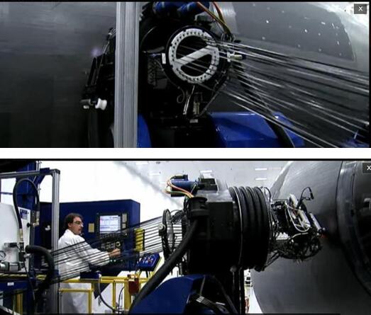 图:波音787铺设复合结构机身,图中黑色束状物就是由预浸过树脂的碳纤维所组成