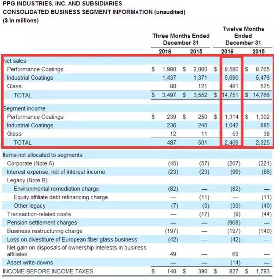 财报显示,PPG工业2016年高性能涂料业务、工业涂料业务、玻璃业务总销售额分别为85.80亿美元、56.90亿美元、4.81亿美元,共计147.51亿美元;三大业务收入分别为13.14亿美元、10.42亿美元、0.53亿美元,共计24.09亿美元。其中,涂料销售收入为142.7亿美元。