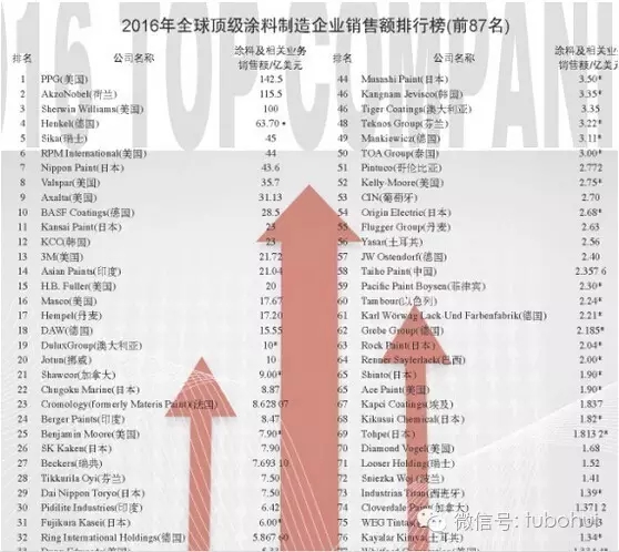 2016年7月,美国Coatings World杂志(July 2016)发布了2016年顶级涂料制造企业销售额排行榜(2016 Top Companies),美国PPG以142.4亿美元销售额位居榜,Akzo Nobel以109.25亿美元销售额居次席,第三名为美国宣伟,销售额为102.4亿美元,老虎涂料则排在第46位。宣伟收购威士伯后2017年销售额或将达到150亿美元,届时位居榜的企业会是PPG还是宣伟呢,一切都还未可知,只能拭目以待。