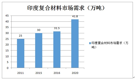 印度的复合材料产量在2015年达到30万吨,预计在2020年达到41.8万吨,年均复合增长率5.8%。这主要归因于风能市场的反弹、交通领域的蓬勃发展、新领域新应用的开发以及印度国内工业生产指数(IIP)的稳健增长。过去五年中(2011-2015),印度复合材料产业的年均复合增长率约为3.6%。