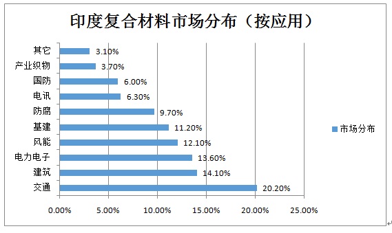 印度的复合材料产业急需进行重新规划、加大科研投入、加快产品升级。2015年,印度复合材料行业主要的客户来自5个领域。这5个领域的复合材料消耗占印度总消耗的71.2%。(参见图表3)其中,交通领域消费了多的复合材料,占总量的20.2%,紧随其后的是建筑领域(14.1%)、电力电子(13.6%)。