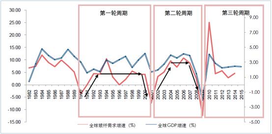 玻纤行业与宏观经济周期较为同步,基本上经济复苏是玻纤行业景气上行的代名词。原因有二:,玻纤行业发展成熟,在市场上已形成高集中度,受区域性市场的需求波动影响较小;第二,玻纤应用范围广且主要分布于工业领域,受单一下游行业影响的程度有限,与宏观经济整体增速同步程度更高。历史数据显示,玻纤需求与GDP 增速相关性高,且由于玻纤材料渗透率在逐步提高,其增速通常高于GDP增速,约为其1.6 倍。