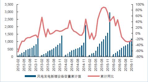 基于三个核心逻辑,2014~2015年玻纤行业景气上行的原因为经济平稳增长、投放放缓和集中冷修带来的供给收缩、以及风电、热塑领域的需求刺激。2016年我国玻纤需求有所有降,主要受风电市场需求回落所致(风电占玻纤下游需求占比约8%,2015年抢装透支部分需求,前10 月新增风电容量增速约-28%),使得粗纱价格显着下滑。我们认为2017年玻纤需求稳中有升,原因为:1)市场需求在升级,汽车轻量化、环保等领域需求持续增长;2)风电需求有望改善,2016年前三季度国内风电招标24GW,同比增长68%,很大程度保证了明年风电装机增长。从角度来看,我们认为美国基建对玻纤需求会有一定的拉动。