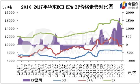 上图为我国环氧树脂原材料及液体树脂毛利变化图,从图中可以看出自2016年四季度开始我国环氧树脂行业利润逐渐好转,2017年一季度行业利润也较为可观,通过同期原材料主流市场价格测算,2017年一季度液体环氧树脂平均毛利在980元/吨左右。环氧树脂毛利走势与其价格走势图趋势相似,这主要是因为原材料价格的变化对树脂影响较为明显,其中原料环氧氯丙烷走势较为稳定,而另一原料双酚A价格的大涨大跌成为业者关注的重点。
