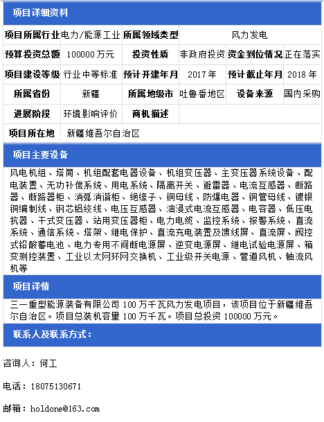 项目名称:三一重型能源装备有限公司100万千瓦风力发电项目