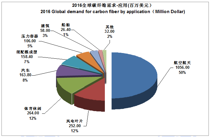 航空航天(包含军工):今年的数据比去年增加10%,由于航空航天是碳纤维复合材料的主要关注点,国际市场结构对这个分市场的数据统计相对一致。