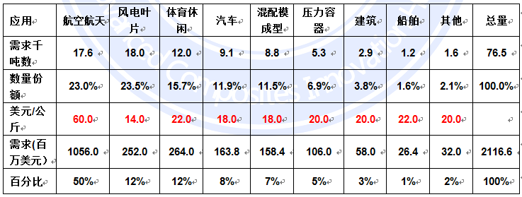 我们大幅度调整了各分市场的平均碳纤维单价,让这些数字更加符合当前市场情况。由于这个调整,使得整个碳纤维需求的金额比去年的数据(2,426.2百万美元)有较大地下降。经过近十年的发展,可以断定:对于碳纤维绝大部分品种,价格过山车的历史不可能重演,已经进入产业不断成熟、成本不断走低的正常轨道。