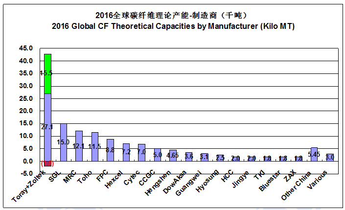 2016年,碳纤维理论产能为139,000吨:其中东丽的6000吨扩产产能已经建成,而ZOLTEK去掉产能1900吨(根据CCEV的报告),2016明底,东丽宣布将ZOLTEK的产能扩大到20,000吨;SGL在美国的第三期的3000吨已经完成,CYTEC(现属于苏威集团)的3000吨扩产已经完成;韩国晓星增加了一条500吨的生产线,并宣布到2020年建成14,000碳纤维的宏伟扩产计划。