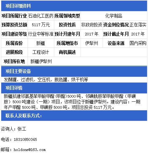 项目名称:新疆拟建邻氨基苯甲酸甲酯(甲酯)5000吨、邻磺酰胺苯甲酸甲酯(甲磺胺)5000吨建设(一期)项目
