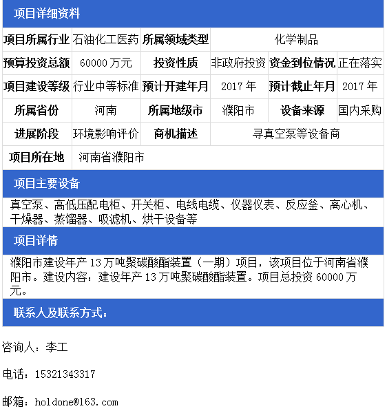 项目名称:濮阳市建设年产13万吨聚碳酸酯装置(一期)项目
