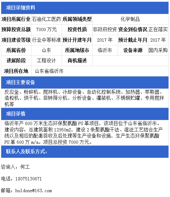 项目名称:临沂年产600万米生态环保聚氨酯PU革项目