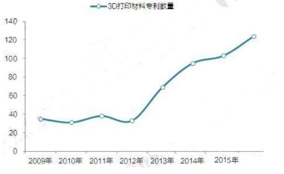 我国近年才引入3D打印技术,与国外相比差距非常大,主要体现在技术和市场应用方面,研发水平不高,与市场衔接度较低,目前还未产生较大的经济效益,从我国近年来的3D打印材料的申请数量来看。我国关于3D打印材料相关的在2009-2012年发展速度较为缓慢,而从2012年以后,我国3D打印材料相关的申请量逐年上升,到2016年为124项。可以见得,我国3D打印材料行业从2013年开始正式进入高速发展期。