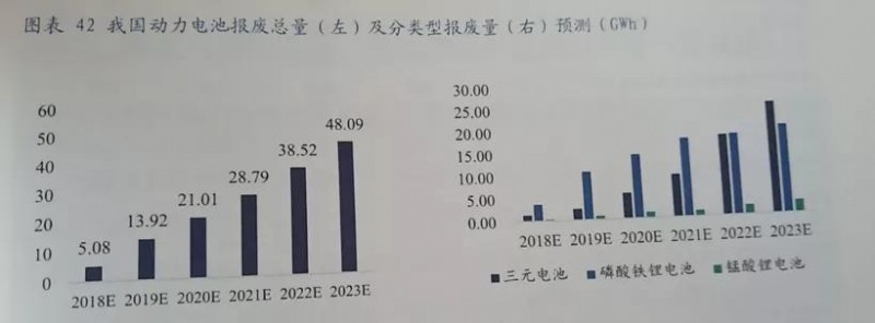 电动汽车百人会《动力电池全生命周期资产运营管理》课题报告显示, 2018年后我国的新能源汽车动力电池进入规模化报废期,预计2023年报废量将达48.09万吨。当中,2018年-2020年报废电池中磷酸铁锂电池占多数,预计2021年起三元电池的报废量开始增多,2023年三元电池的报废量将大于磷酸铁锂电池。