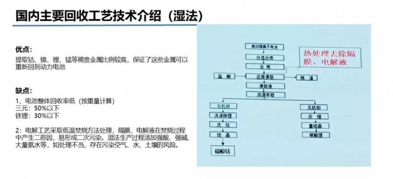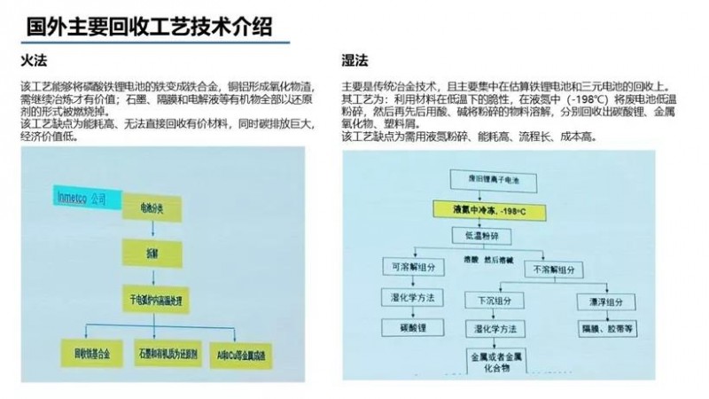 有效提高电池正极的材料回收率是再生技术的关键,而在回收工艺技术方面,据北京赛德美资源再利用研究院有限公司董事总经理赵小勇介绍,目前国外通常采用的有火法和湿法两大类,相对而言,湿法回收工艺应用者较多。