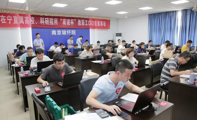 为大力弘扬劳模精神、劳动精神、工匠精神,激励一线职工苦练岗位技能,持续提升职业技能水平,更好地服务企业改革发展,7月25日,由江苏省教育科技工会主办,南京玻纤院工会承办的“当好主人翁 建功新时代”2019年直属高校、科研院所“南玻杯”教职工CAD应用技能大赛在南京玻纤院1号行政楼隆重举行。来自江苏开放大学、南京航空航天大学、南京邮电大学、南京工程学院、三江学院、南京航空航天大学金城学院、南京林业大学、南京信息工程大学、国网电力科学研究院、南京农业机械化研究所、南京水利科学研究院、南京野生植物研究院、中电莱斯集团(28所)、中船重工七二四所、中电国基南方集团(55所)、煤炭科学研究总院南京研究所、南京水利水文自动化研究所、南京玻纤院8所高校和10家科研院所的近30名选手参加竞赛。