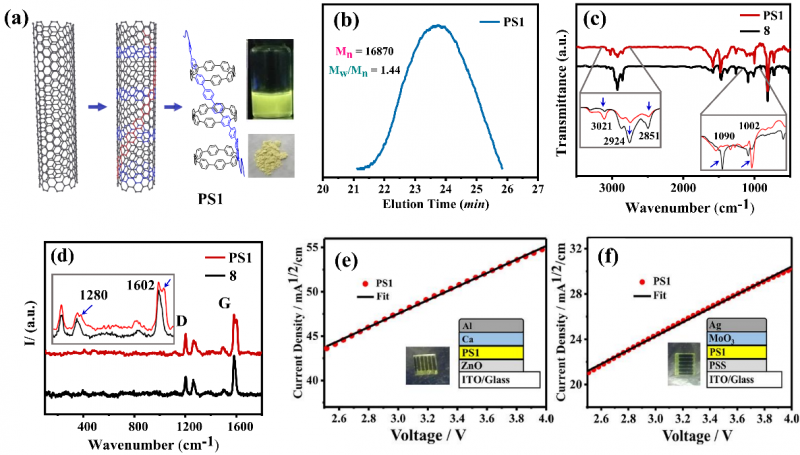图2. 单一手性碳纳米管的长共轭链段结构PS1及其性质研究。(a)PS1的结构及其在溶液中发光; (b-d) PS1的凝胶渗透色谱、红外和拉曼光谱表征以及与单体8对比结果;(e-f) PS1中的载流子输运性质,兼具电子传输和空穴传输性能。