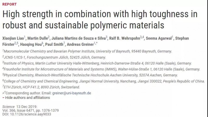 德国拜罗伊特大学Andreas Greiner团队通过改进分子交联让碳纤维既强又韧。相关论文以“High strength in combination with high toughness in robust and sustainable polymeric materials”为题,于今日凌晨发表在《Science》杂志上。,作者为Xiaojian Liao,合作作者还包括来自江西师范大学侯豪情教授。