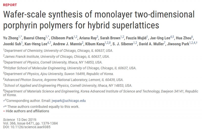 芝加哥大学Jiwoong Park教授课题组提出了一种制备大面积单层二维高分子的新方法,并成功实现了有机-无机二维材料的层层组装超晶格结构。相关工作以“Wafer-scale synthesis of monolayer two-dimensional porphyrin polymers for hybrid superlattices”为题,于2019年11月7日在Science 期刊上以First Release的形式在线发布 。今日凌晨正式上线。论文共同作者为芝加哥大学化学系钟宇博士和研究生成宝睿。