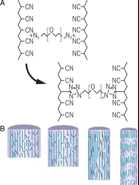 图1. 通过共聚反应形成的梯形聚合物结构(A)以及具有该微特征的纤维组织结构在牵伸过程中的演变示意图(B)。