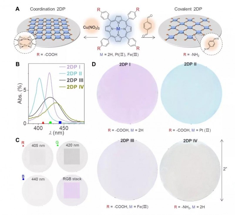 单层二维高分子是将单体分子通过共价键或配位键连结成具有二维周期性结构的材料。在该研究中,Jiwoong Park课题组合成了四种基于卟啉单体的二维高分子,包括共价型和配位型两种类型(也可分别称为二维共价有机框架和二维金属有机框架)。它们的性质和结构由不同的单体分子和聚合反应来调控。图1展示了四种二维高分子的结构以及被转移到直径为5厘米的石英玻璃衬底上之后的合成光学图片。光学图像显示了不同二维高分子有着不同的吸收谱,并且所有二维高分子在厘米级的尺度上有着高度均匀性。