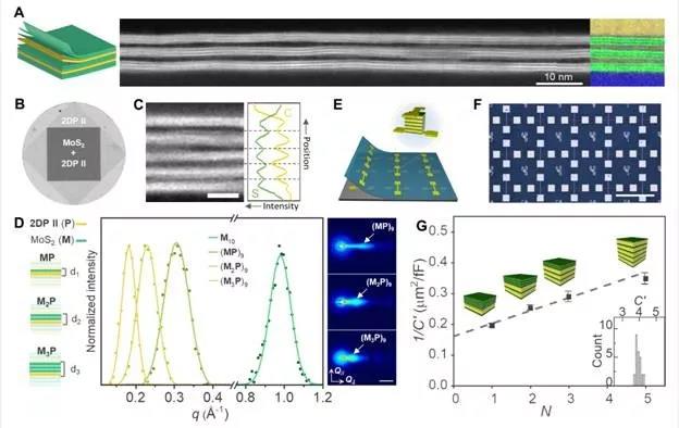 另外,研究者也展示了利用单层二维高分子和无机二维材料通过层层组装的方式构建有机无机超晶格结构。在杂化超晶格材料中,不仅每层的组分能够任意选择,而且能够通过改变堆叠的次序来调控结构或超晶格常数。并且,这种杂化超晶格可以直接用于制备大面积的电子器件阵列。