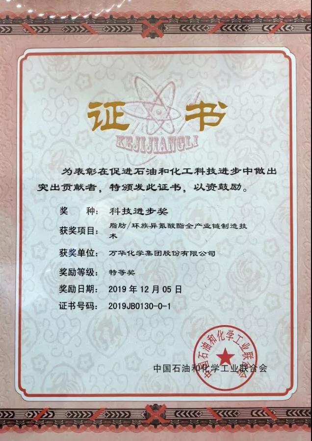 12月10日,以鼓励创新、表彰先进为主旨的石油和化工科技创新大会在北京召开。万华化学脂肪/环族异氰酸酯全产业链制造技术获得由石油和化学工业联合会颁发的科技进步特等奖。