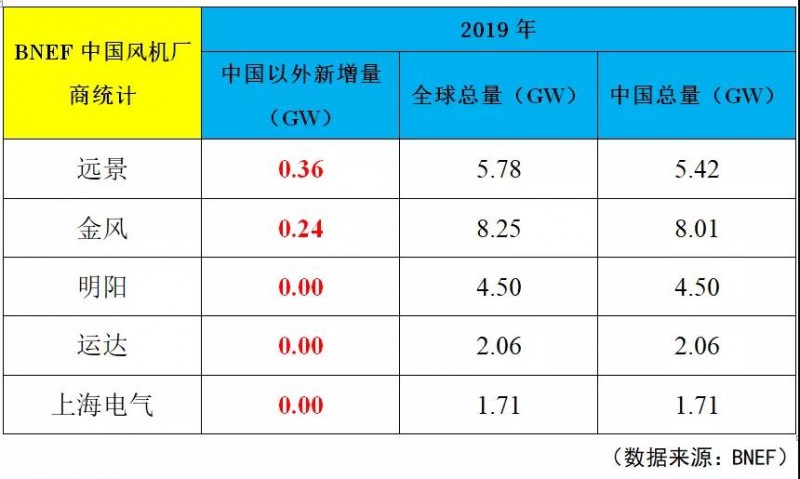 日前,彭博新能源财经(BNEF)发布2019年风电整机商新增吊装容量数据,经统计,2019年风机企业在海外的累计新增吊装0.6GW。远景能源以0.36GW的海外风机吊装量,居于风电整机商海外新增吊装量榜。金风科技以0.24GW的海外风机吊装量,居于第二。明阳、运达、上海电气等设备企业未显示有海外吊装业绩。