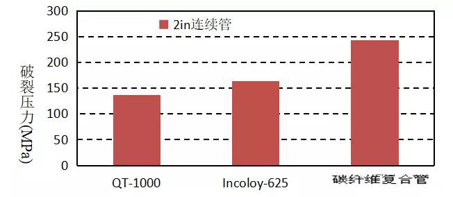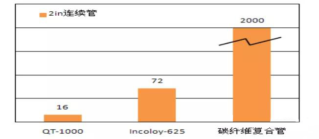 碳纤维复合连续管由碳纤维增强环氧树脂结构层和热塑性内衬构成,外部由耐磨热塑性材料包覆。目前,2in常规连续管QT-1000的破裂压力仅为140MPa,不能满足超高压水射流钻井技术的需要。而商业应用的碳纤维复合管破裂压力能够达到207MPa,满足超高压水射流作业要求,如图1所示。内压为83MPa的条件下,2inQT-1000 连续管起下钻16次后即失效,QUALITY TUBING公司的Incoloy-625连续管的疲劳寿命为70次,而FIBERSPAR SPOOLABLE PRODUCTS 公司的碳纤维复合连续管的疲劳寿命超过2000次,如图2所示。
