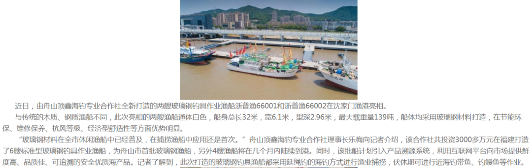 现在,又有了一家关于玻璃钢渔船产业集群的新闻,由舟山顶鑫海钓专业合作社全新打造的两艘玻璃钢钓具作业渔船浙普渔66001和浙普渔66002在沈家门渔港亮相。