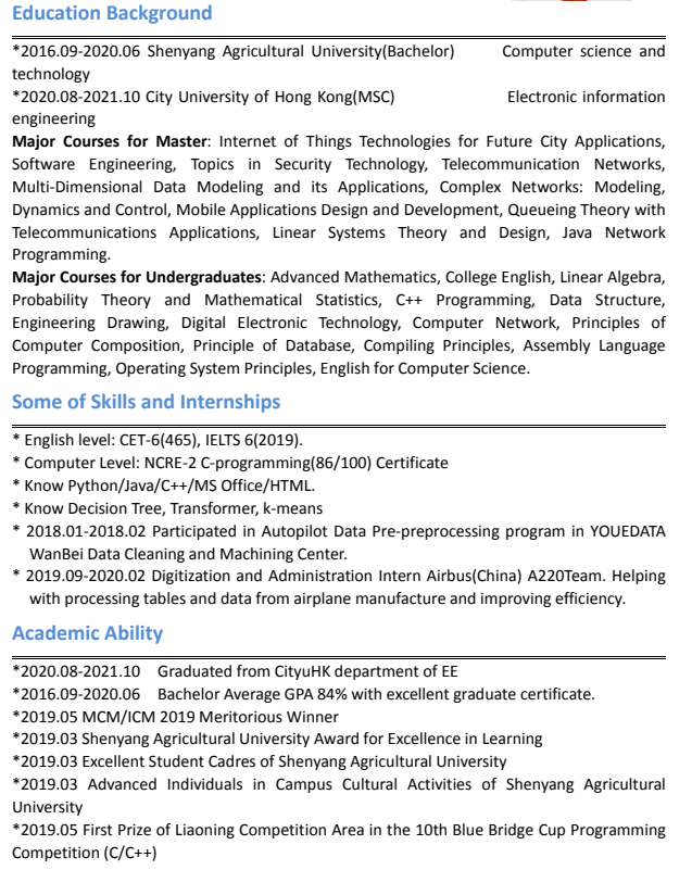 | 毕业院校 | City University of Hong Kong(MSC) | 专 业 | Electronic information engineering | |