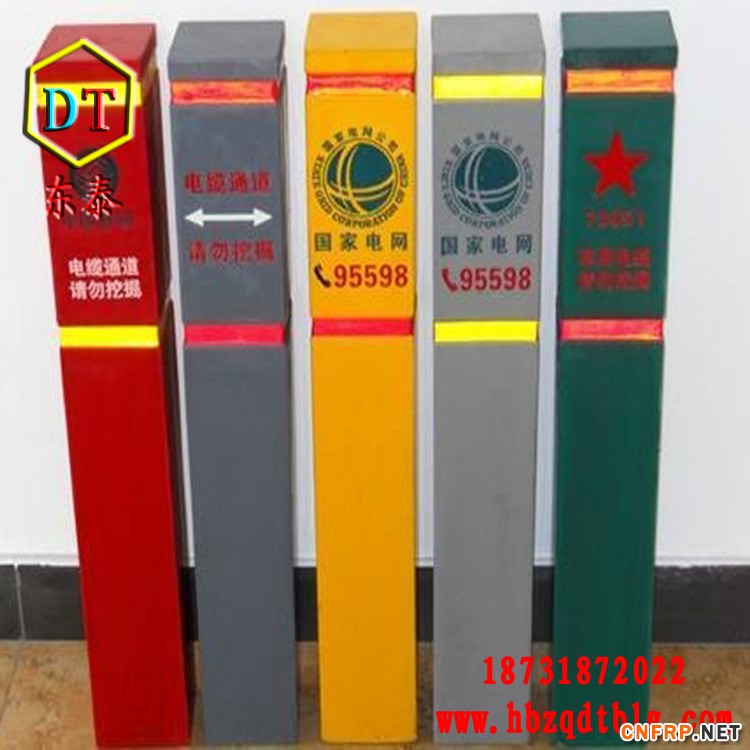 玻璃钢标志桩:经高温压制而成。抗冲击,耐磨损,耐高温,耐腐蚀,可以抗水、汽油、酒精、电解盐、醋酸、盐酸、钠钾化合物、尿、沥青,适合各种酸碱土壤。使用寿命长达30年。内容采用丝网印刷技术,警示效果好,不需要维护。重量轻,便于运输安装。无回收价值,自然防盗。[2]