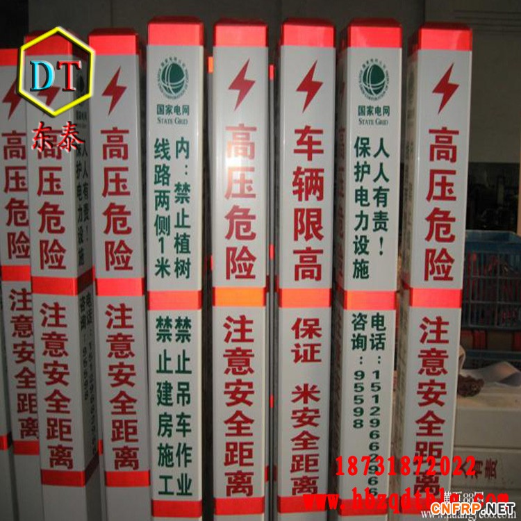 玻璃钢标志桩:经高温压制而成。抗冲击,耐磨损,耐高温,耐腐蚀,可以抗水、汽油、酒精、电解盐、醋酸、盐酸、钠钾化合物、尿、沥青,适合各种酸碱土壤。使用寿命长达30年。内容采用丝网印刷技术,警示效果好,不需要维护。重量轻,便于运输安装。无回收价值,自然防盗。[2]