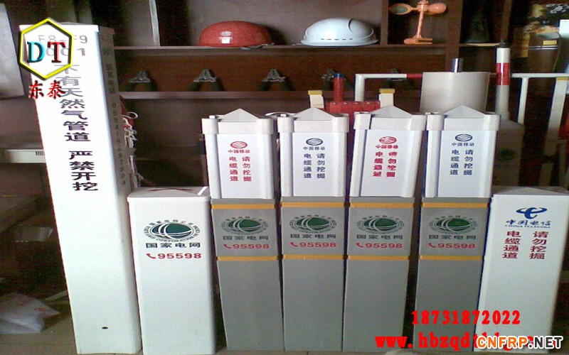 玻璃钢标志桩:经高温压制而成。抗冲击,耐磨损,耐高温,耐腐蚀,可以抗水、汽油、酒精、电解盐、醋酸、盐酸、钠钾化合物、尿、沥青,适合各种酸碱土壤。使用寿命长达30年。内容采用丝网印刷技术,警示效果好,不需要维护。重量轻,便于运输安装。无回收价值,自然防盗。[2]