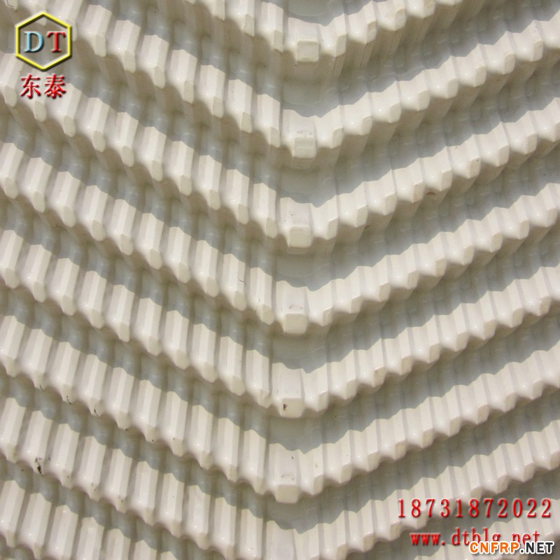 枣强县东泰玻璃钢制品有限公司:玻璃钢冷却塔填料是冷却塔的重要组成部分,是冷却塔热交换的关键部件,与冷效高低直接有关,其质量和作用在很大程度上决定着冷却塔的冷却能力,根据调查得 出,填料产生的降温达到整个塔降温的60%~70%。它一般由凸凹不平的聚氯乙烯波纹板制成,亲水性能良好,保证水在填料上形成水膜和水滴,而不是水流, 增强水气交换面积,延长水气交换时间,保证冷却效果。