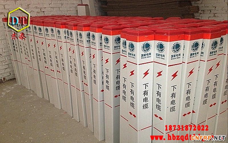 玻璃钢标志桩:经高温压制而成。抗冲击,耐磨损,耐高温,耐腐蚀,可以抗水、汽油、酒精、电解盐、醋酸、盐酸、钠钾化合物、尿、沥青,适合各种酸碱土壤。使用寿命长达30年。内容采用丝网印刷技术,警示效果好,不需要维护。重量轻,便于运输安装。无回收价值,自然防盗。[2]