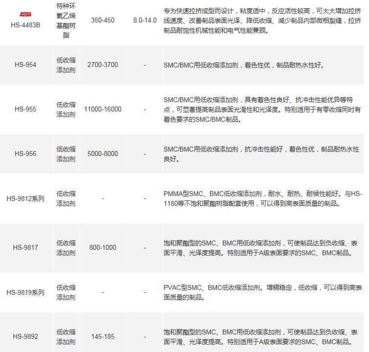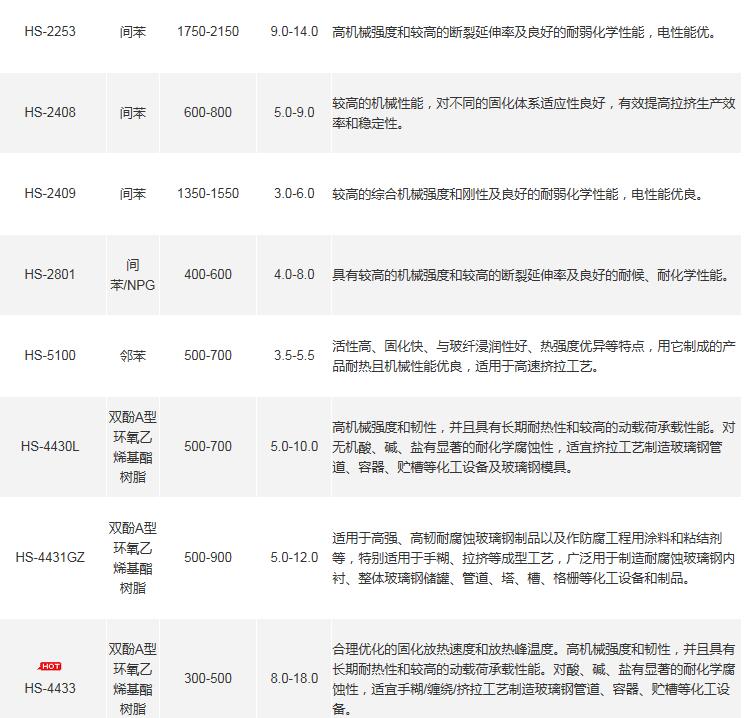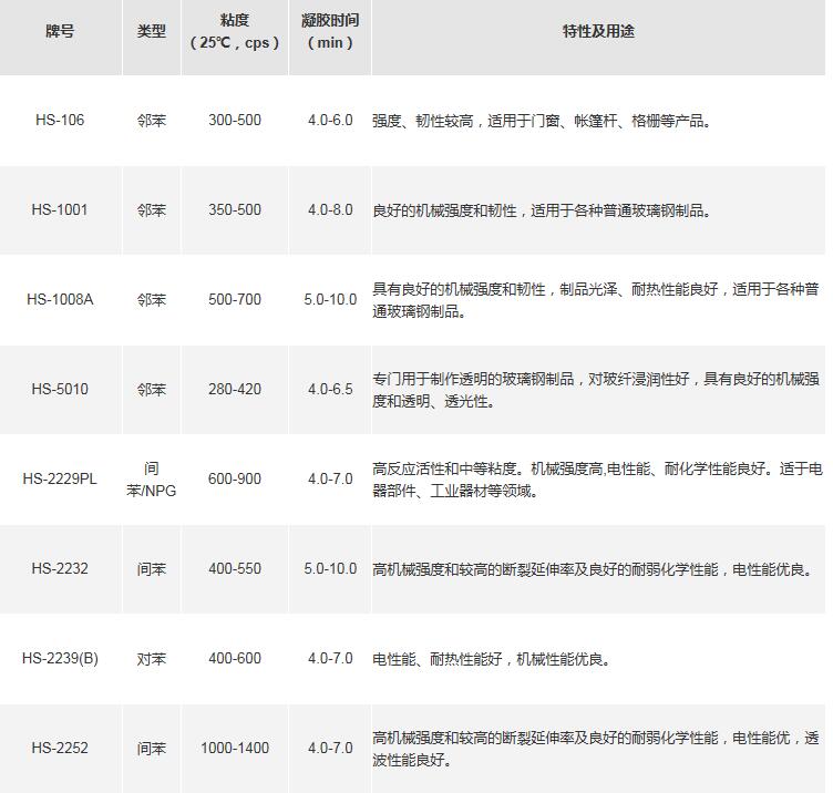 产品牌号、类型、粘度、凝胶时间、特性及用途如下图