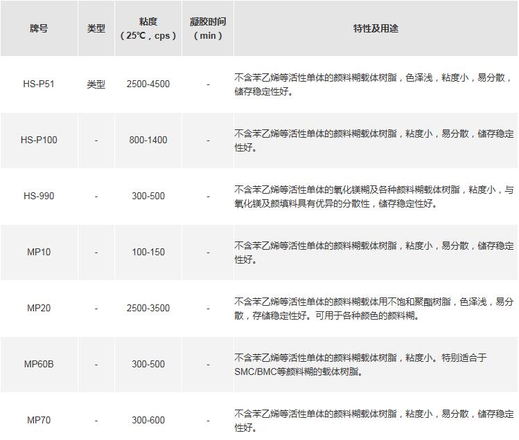 产品牌号、类型、粘度、凝胶时间、特性及用途如下图