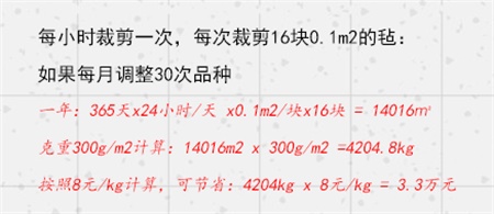 c)减少浪费。人工测量必须裁剪下来一块进行测量。在更换品种时,将会测反复测量很多次,因此在调整期间,生产出的自然是不合格品,造成浪费。如果采用玻纤织物在线克重检测装置,则每年可直接节省这笔费用: