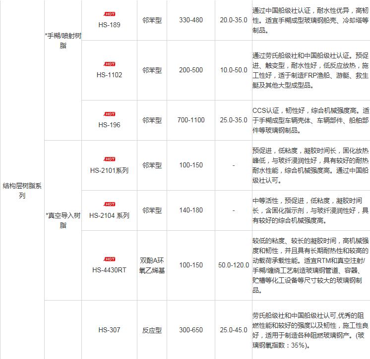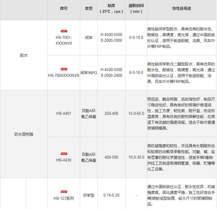 产品牌号、类型、粘度、凝胶时间、特性及用途如下图
