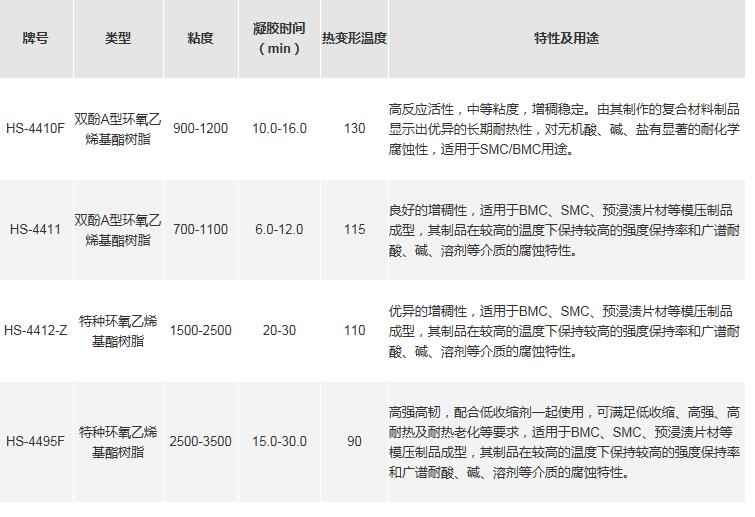产品牌号、类型、粘度、凝胶时间、特性及用途如下图
