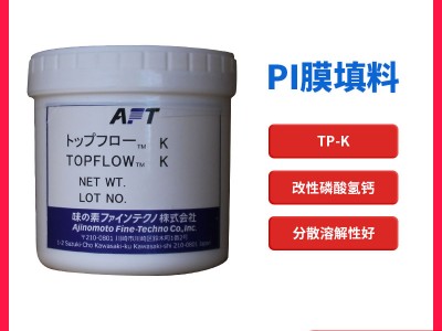 所属类别:PI膜填料 -> TOPFLOW-K 产品名称:TOPFLOW-K 简 介:改性磷酸氢钙,电子级PI膜专用填料 为聚酰亚胺薄膜开发的专用填料,经过表面特殊处理磷酸氢钙,对PI膜具有绝佳的剥离性及韧性。
