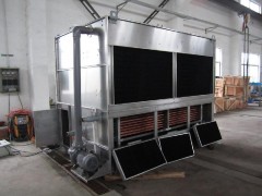 华盛横流密闭式冷却塔采用一层紫铜盘管一层填料的排布形式,增加外部喷淋水的换热滞留时间,并保证能在盘管外侧形成均匀水膜。进风为两整面进风,进风面较大,风横掠过换热器的表面,通过带走蒸发的热湿空气来给换热器内流体降温。